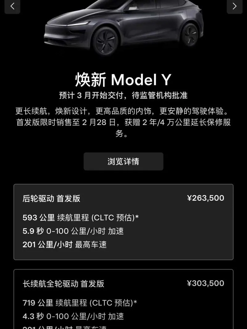 🔴特斯拉Model Y焕新版已于今日上市,两款车型,售价分别为26.35万和30.35万