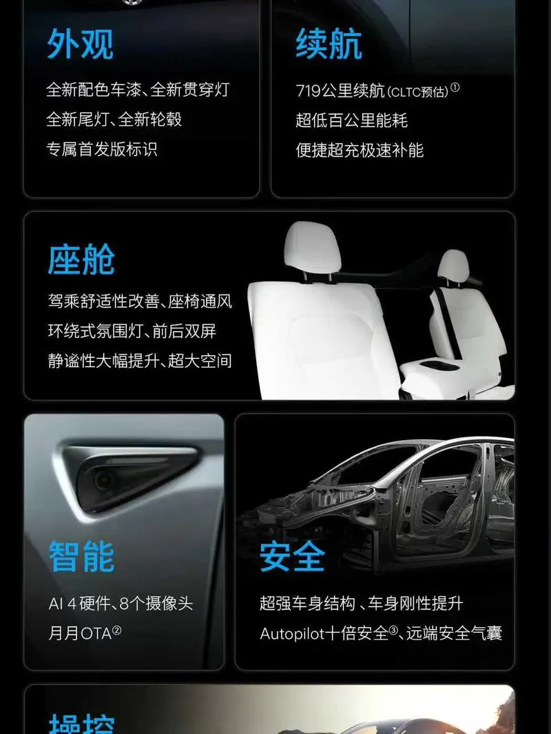 🔴焕新Model Y首发版拥有首发版标识,包括尾门徽章、迎宾灯徽章投影、迎宾踏板文字标识、手机充电底座文字标识、高级织物地毯脚垫、纯黑麂皮质感装饰。此外,还赠送2年/4万公里延长保修服务,限时预售至2月28日
