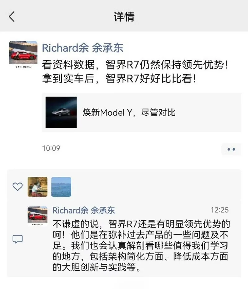 余承东对比特斯拉新款Model Y:智界 R7依然保持领先