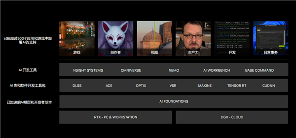 Omniverse、Nemo、DLSS、ACE、Optix、VSR、Maxine、TensorRT、CUDNN……如此丰富的开发工具,恐怕仅此一家。