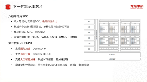 此外,第二代自研GPU将支持OpenGL4.0图形加速,同时支持OpenCL3.0通用计算,集成了INT8张量计算加速部件,进一步支持人工智能加速,并增强了架构的伸缩能力。
