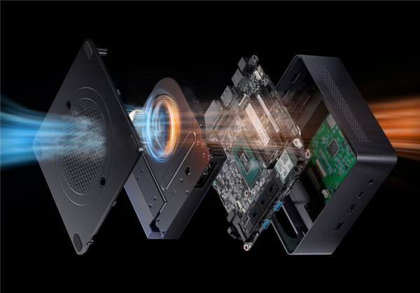 散热方面,原子侠X7 Ti迷你主机搭载了Cold Wave散热系统,该系统采用了独家专利的紧凑型相变散热模组,搭配大口径静音散热风扇和3根散热铜管,可以实现稳定65W的性能释放。