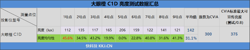 CVIA亮度标准最大允许有20%的浮动范围,那么实际亮度为300CVIA流明的大眼橙C1D最大可宣传亮度值为375CVIA流明,与官方标称的560CVIA流明有一定差距,虚标了26%。