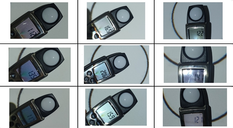 测试前将投影仪重置到出厂默认值状态,输入与投影仪固有分辨率一致的白场信号运行半小时以上时间,使其工作状态趋于稳定,将白场色温设定在6000K-10000K之间,然后使用TESTO540照度计测试如上图所示9个点位的照度值。