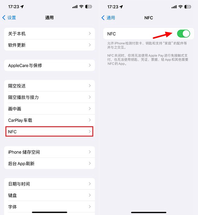 iPhone用户需进入 设置 -> 通用 -> NFC ,然后开启相应功能。