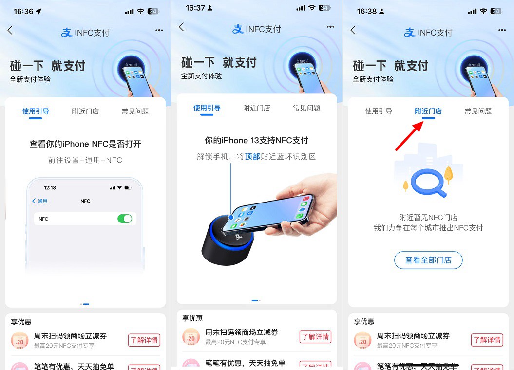 3、确保您所在的区域有商家支持支付宝NFC付款功能。