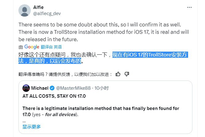 Michael 发文后,还得到开发者大神 opa334 和 Alfie 双重确认。