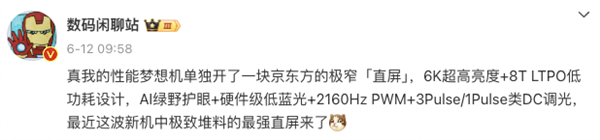 所以真我GT6的这波尝试还是很值得期待一下的,据爆料,真我GT6将搭载来自京东方的极窄边框直屏,参数相当顶:峰值亮度达到6000nit,支持8T LTPO技术、AI绿茵护眼、硬件级低蓝光以及2160Hz PWM调光和3Pulse/1Pulse类DC调光。