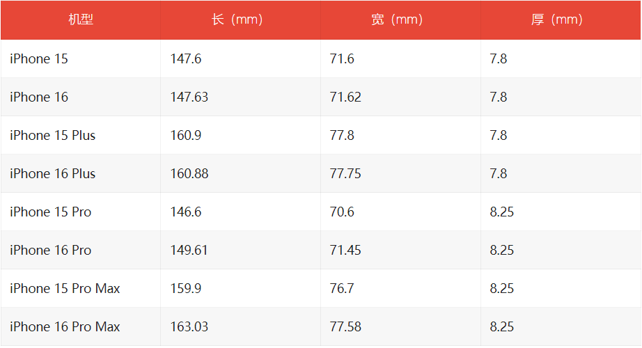 以下是iPhone 16全系与iPhone 15全系机型的尺寸对比图:
