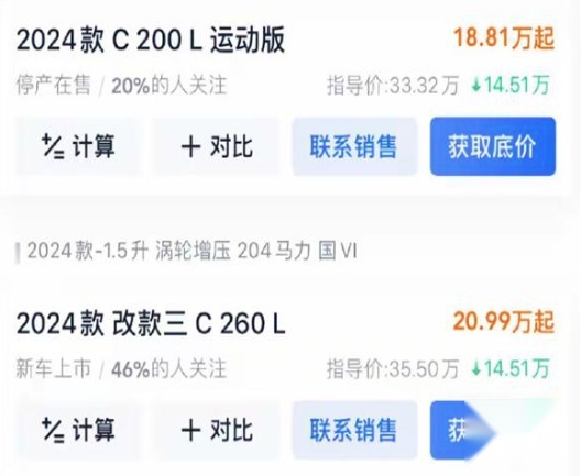 就小编目前得知,奔驰旗下多款车型开启了腰斩式大降价,油车中的奔驰C200L,指导价为33.48万,部分经销商直接给出了20.27万元的报价,优惠力度直接达到了13万元之多。