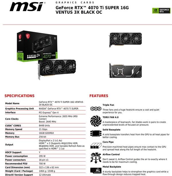 RTX 4070 Ti SUPER最初使用的是AD103-275,而在微星最新发布的万图师Ventus 3X Black OC显卡上,赫然换成了从未见过的AD102-225。