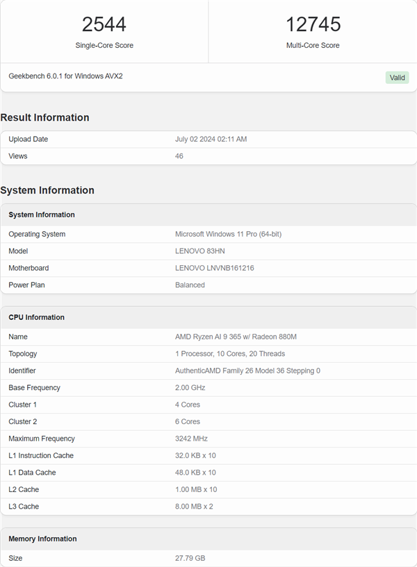 科技号7月3日消息,搭载了AMD最新Ryzen AI 9 365 "Strix" APU的联想新款IdeaPad笔记本电脑近日现身Geekbench基准测试平台,配置了32GB LPDDR5x内存,型号为"LENOVO 83HN",基于主板型号LNVNB161216,确认属于IdeaPad系列。