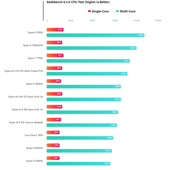 性能测试结果显示,Ryzen AI 9 365 APU单核得分2544分,多核得分12745分,相较于Ryzen 9 8945HS,单核性能提升了7%,多核性能提升了9%。