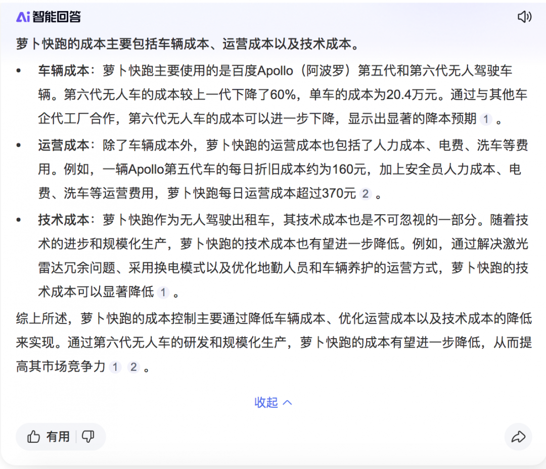 百度方面曾披露,随着萝卜快跑无人车自动运营网络完成建设,营运成本将降低30%,通过自动驾驶技术和人车舱效率的持续优化,服务成本将降低80%。