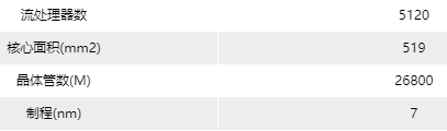 它的流处理器数为5120,核心面积为519mm²,晶体管数目为268亿,制程为7nm;