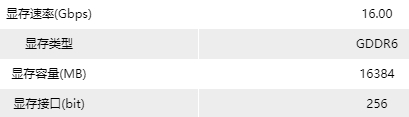 显存速率为16Gbps,显存类型为GDDR6,显存容量为16384MB,显存接口为256bit;