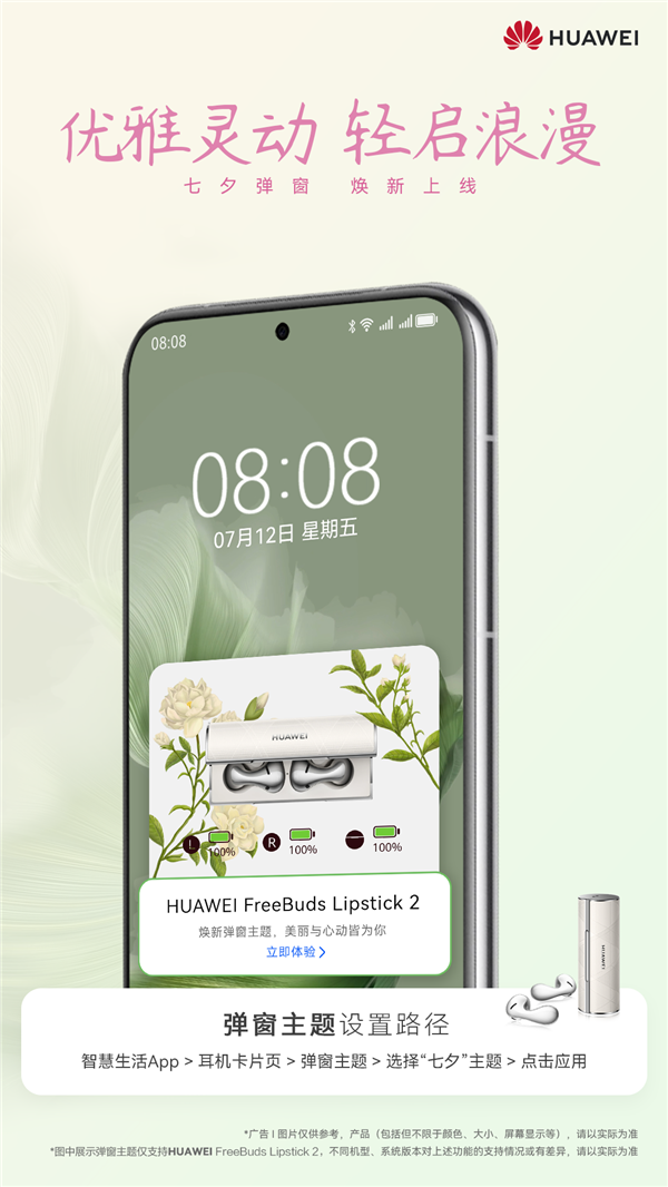 值得一提的设计,华为官方还将推出三款七夕主题弹窗,其中包含2款口红耳机专属弹窗,用户可根据自己的喜好,在智慧生活APP——耳机卡片页——弹窗主题——选择“七夕”主题——点击应用,更换七夕主题弹窗,让听歌仪式感拉满。