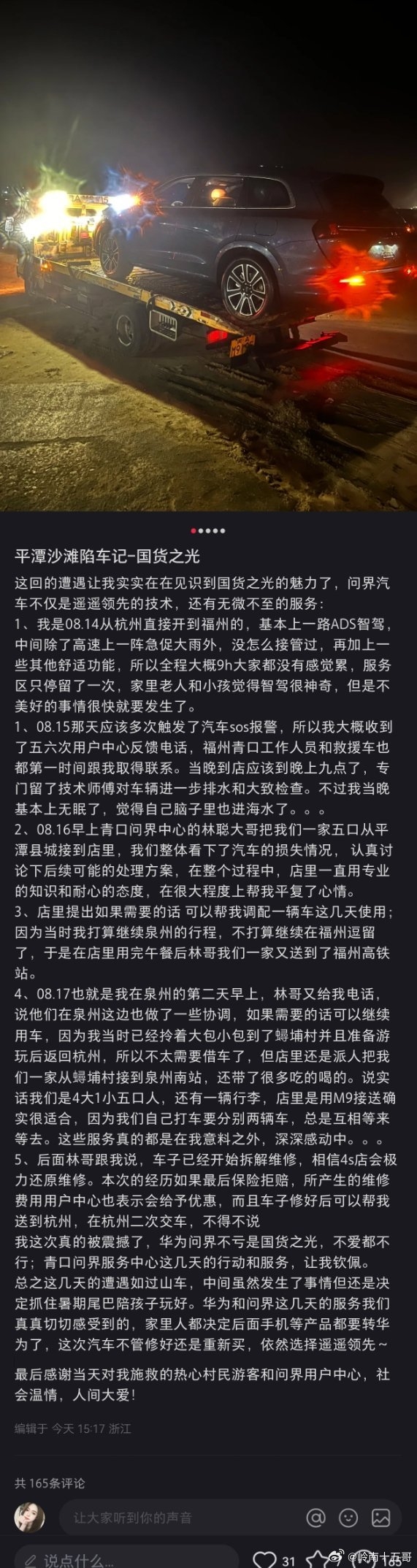 日前,车主在社交平台上发文详细介绍了车辆被淹的始末,车主对车险公司员工的行为不够认同,但对AITO问界服务中心提供的后续服务很是满意。