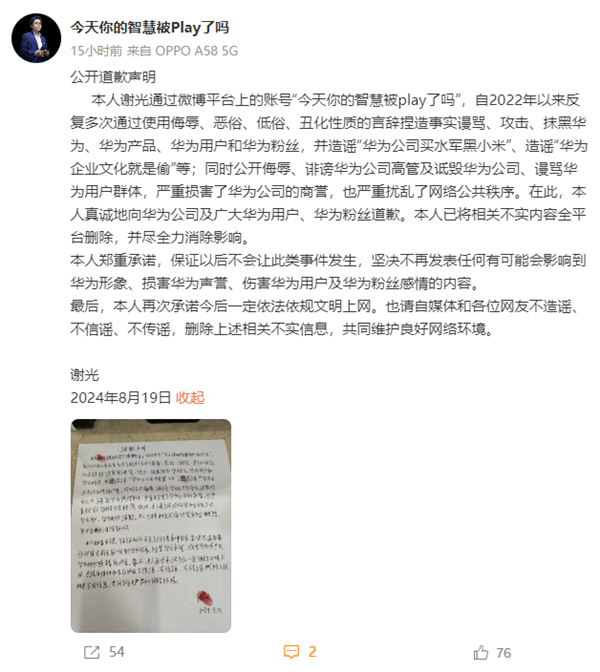 电脑知识网8月20日消息,昨日晚间,一微博用户公开向华为及华为用户致歉,并奉上了手写道歉声明,以下为原文: