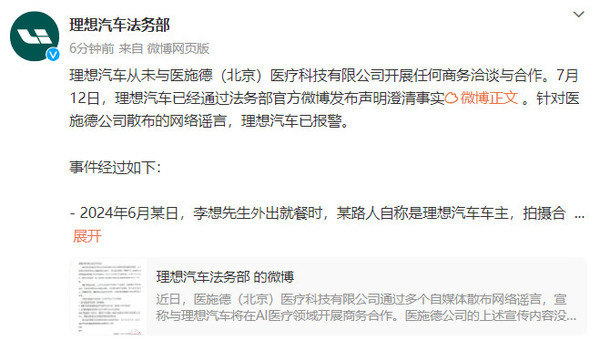 理想汽车强调,理想汽车从未与医施德(北京)医疗科技有限公司开展任何商务洽谈与合作。7月12日,理想汽车已经通过法务部官方微博发布声明澄清事实。
