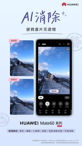 华为Mate 60系列搭载的AI消除功能,无疑是此次升级的一大亮点。无论是户外自拍时衣物上的意外污渍,还是景区打卡时穿梭的人群,亦或是背景中突兀的垃圾、电线杆等杂物,只需轻轻一点,这些不和谐的元素瞬间消失无踪,留下的只有干净、自然的画面。