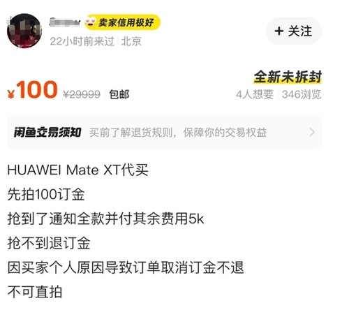 根据第三方调研机构的报告,该机官方定价可能在1.49万元左右。由于其创新性的设计和有限的货源,许多业内人士认为这款手机将成为一款电子“茅台”,甚至不少网友也发现,二手平台已经有上架这款手机,出价大多都是3-4万元,就连代抢也要收5000元的服务费,妥妥的变成了理财产品。