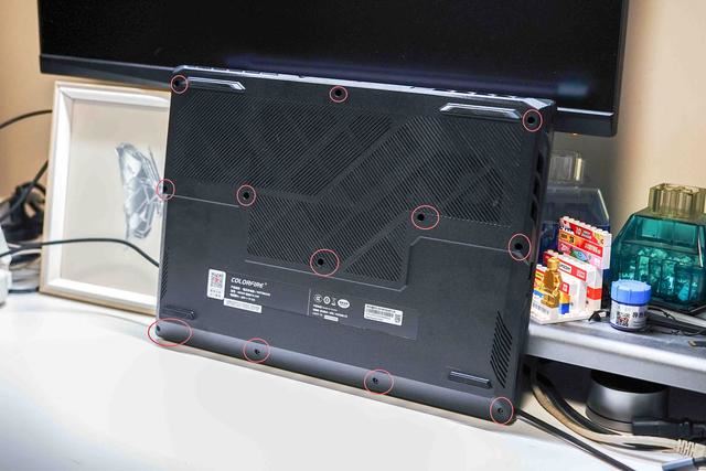 七彩虹MEOW R16拆解还是比较简单的,首先拆掉12颗固定螺丝,具体看下图圈出来的地方,有普通四角批头的螺丝刀都行。