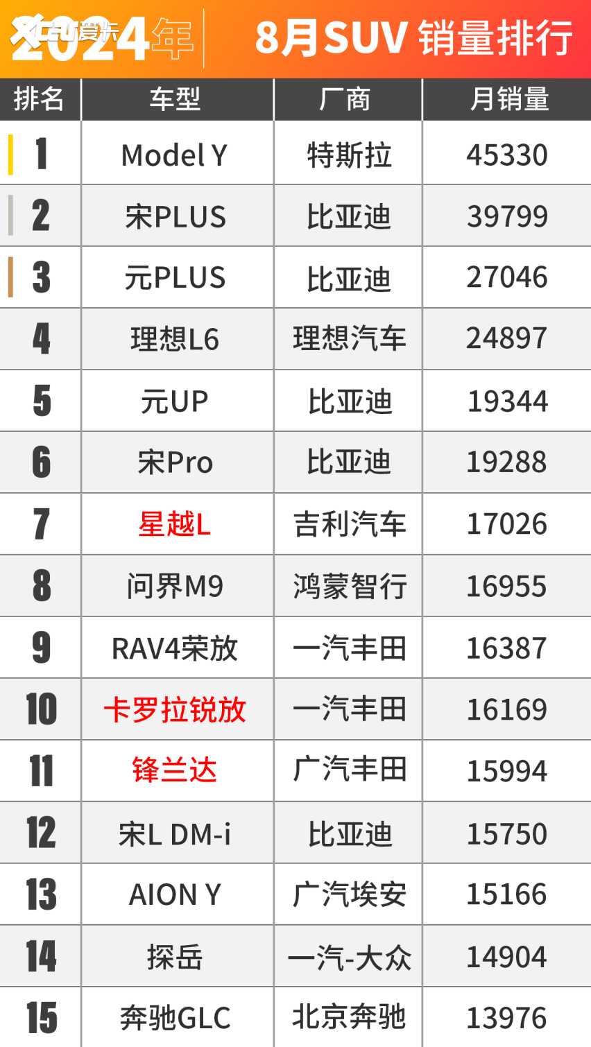 在燃油SUV市场中,一直有两台闷声发财的产品,它就是丰田锋兰达(参数|询价)和卡罗拉(参数|询价)锐放两台姊妹车。8月份,这两台车的合计销量达到了3.2万台,甚至比元PLUS卖得还多。虽然这两台车看起来空间不大,动力配置也比较一般,但这两台车油耗低、价格便宜、并且还有丰田的可靠性背书,对于传统消费者来说还是值得信赖的。另外,前段时间中保研也对卡罗拉锐放做了测试,除了副驾驶约束能力一般外,这台车在结构安全性上也没有问题。