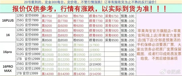 (报价表引自微博博主@肥威)