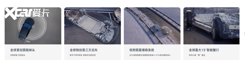 首先来看全球首搭的易三方技术,它是由三电机独立驱动技术、后轮双电机独立转向技术、VMC整车运动控制技术和全系CTB电池车身一体化技术四大核心技术组成。在传承易四方的精准控制能力和安全性能的基础上,具备专属特色功能,且兼顾纯电和混动模式,完美融合了灵动、智慧、安全三大特性。前一后二,三个电机可输出966马力,零百加速3秒级。