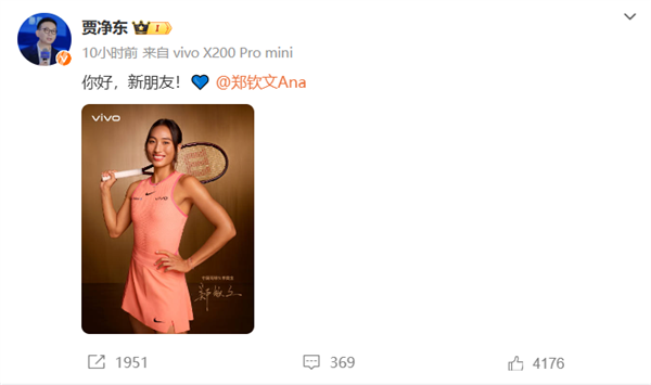 值得一提的是,vivo品牌副总裁、品牌与产品战略总经理贾净东今日在微博晒出郑钦文海报,并发文“你好,新朋友!”,同时@郑钦文。