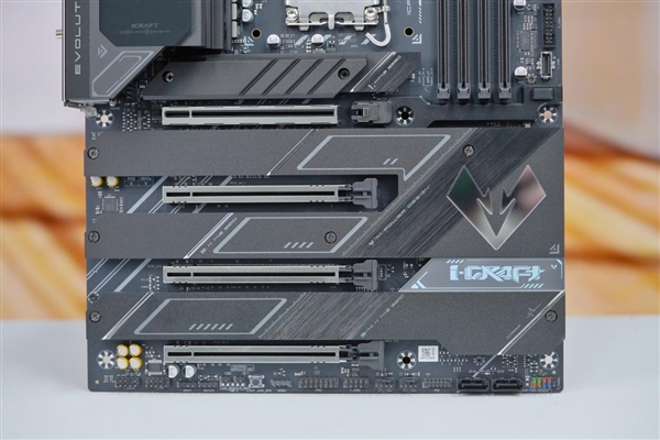 主板的PCIe5.0接口被巧妙地设计为双×8插槽,提供了卓越的扩展性和灵活性,同时还有3个PCIe4.0的M.2盘位,满足用户对存储和速度的高标准要求。