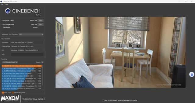 在“野兽模式”“最佳性能”的设置下,拯救者Y7000 2024带来了出色的性能表现。它在CINEBENCH R23中得到单线程1908pts、多线程20078pts的成绩。对比大多数酷睿i7-13700H机型(单线程1850pts左右、多线程17000pts左右),这台机器在单线程性能上领先大约3%,在多线程上则有近18%的突出优势。这样的测试成绩表明,得益于酷睿HX处理器更高的性能释放水平,拯救者Y7000 2024具备强悍的整机性能。