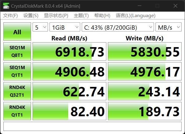 拯救者Y7000 2024标配一块512GB PCIe 4.0规格的长江存储SSD,根据CrystalDiskMark 8.0.4的测试成绩来看,这块SSD的顺序读取速度达到6918.73MB/s,顺序写入速度达到5830.55MB/s。如此表现相当出色,完全发挥出了PCIe 4.0协议的优势,无论是加载《黑神话:悟空》之类的3A大作还是拷贝大容量资料,能够为用户带来疾速体验。更重要的是,这台机器的内部预留了双M.2 SSD扩展插槽,有需要的话可以随时升级SSD容量。