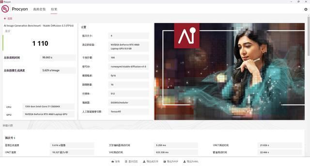 这里面大多数人都熟悉的例子是绘图应用Stable Diffusion WebUI。在UL Procyon基于Stable Diffusion 1.5的AI生图测试中,拯救者Y7000 2024取得1110的总分,借助RTX 4060 Laptop GPU的TensorRT引擎,一次性生成16张512×512分辨率的图片仅耗时90.063秒,总体图像生成速度达到5.629秒/张。这样的表现完全能够满足AI爱好者的需求。
