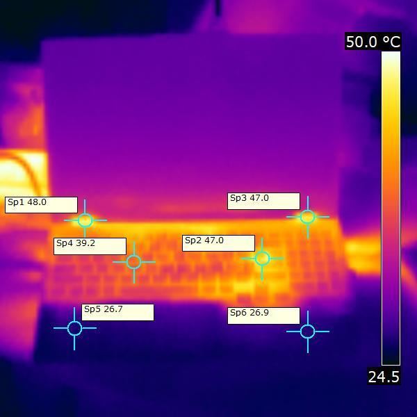 我们在24.4℃室温通过AIDA64软件和Furmark软件对这台机器进行双烤测试。双烤30分钟后,我们通过FLIR热成像仪观察到机身正面外表最高温度为48℃,位于C面左侧的出风口附近,键盘中部区域的温度保持在39.2℃,键盘右侧回车键附近的温度为47℃,腕托位置的温度为26.9℃左右。
