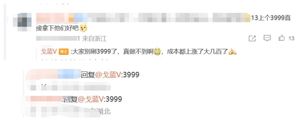 不少网友在iQOO产品经理戈蓝V微博下刷“3999”,对此他表示,3999真做不到,成本都上涨了大几百,暗示iQOO 13会涨价。