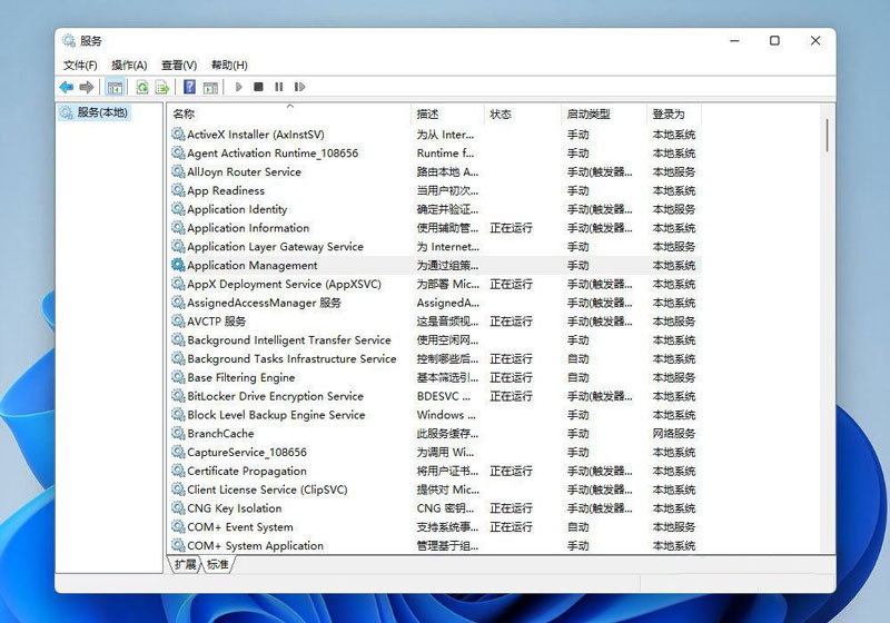 在「服务」管理器中,会按字母顺序列出:服务的名称列表、简要描述、当前状态、启动类型和登录身份等信息。