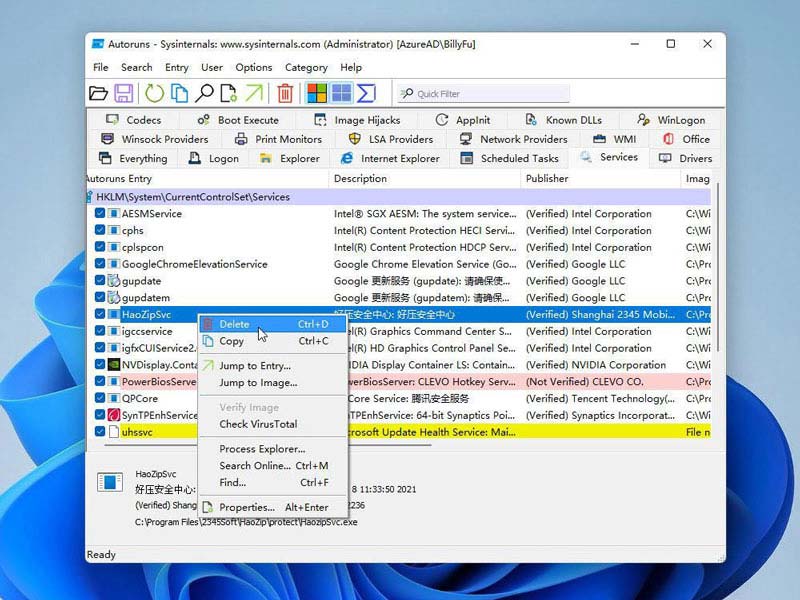 最后,我们还可以使用 Sysinternals 工具集里的 Autoruns 工具来卸载 Windows 服务: