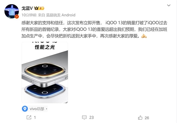 iQOO产品经理戈蓝V表示,大家对iQOO 13的喜爱远超出我们预期,我们已经在加班加点生产中,会尽快把新机送到大家手中,再次感谢大家的厚爱。