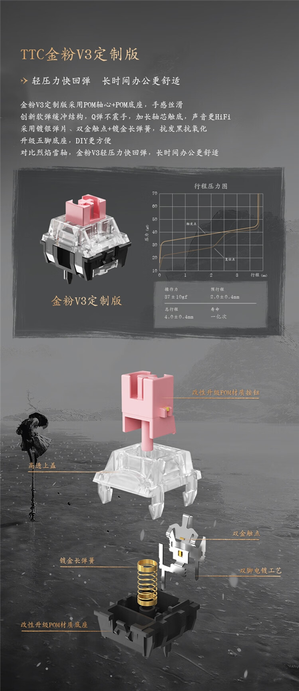 金粉轴V3定制版则在原版的基础上升级为镀金弹簧,整体更加经久耐用,独家首发该轴体的《墨染乾坤》联名键盘也就成了收藏必备,错过限量版就只剩遗憾。