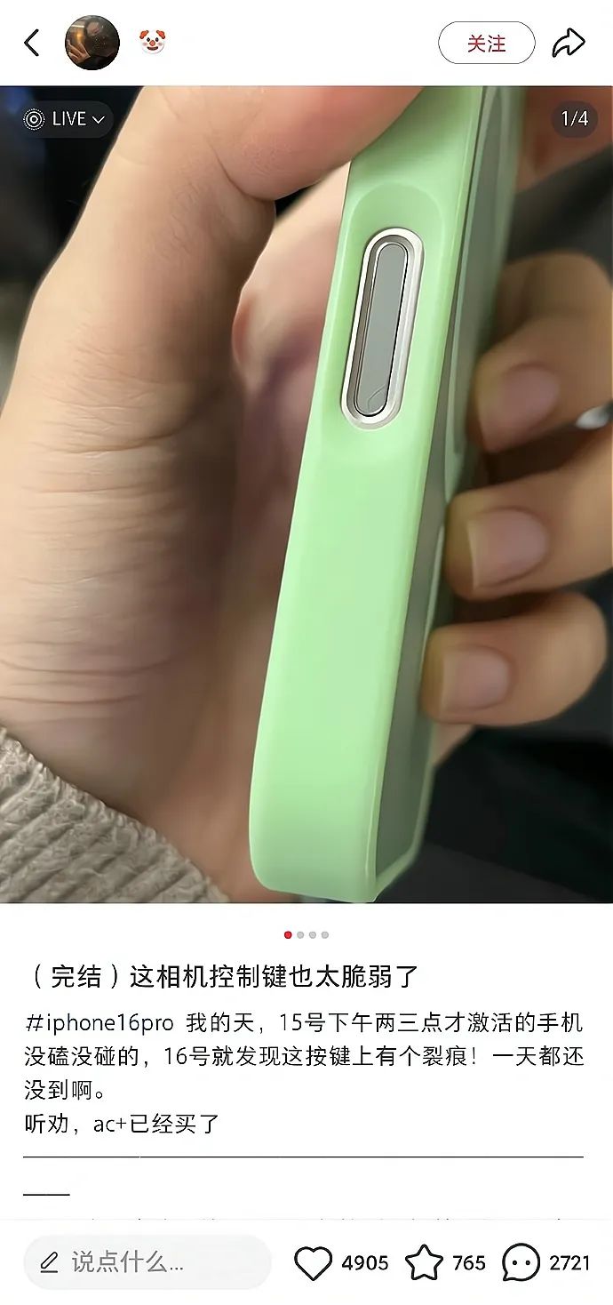 接连两位苹果爱好者报告iPhone 16 Pro相机按键破损的问题,这明显表明这一问题并非孤立事件,而可能是设计或制造过程中存在的某种缺陷。