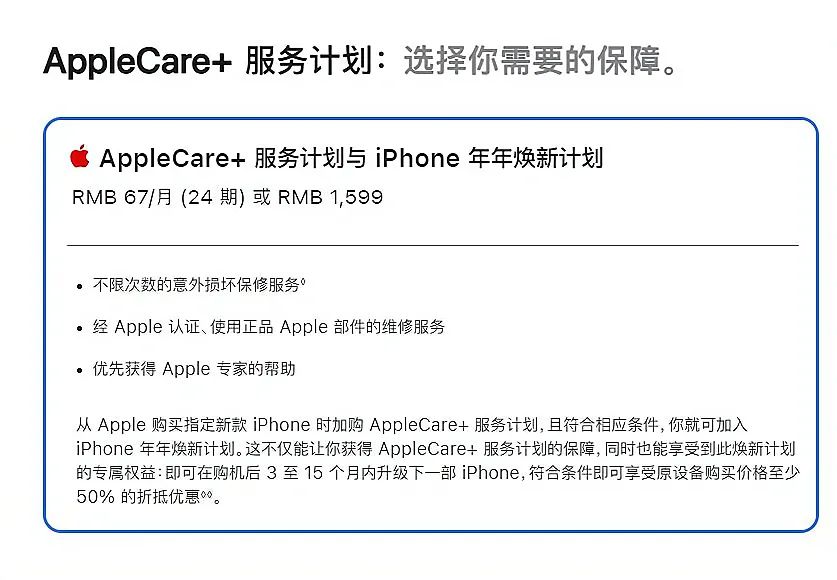 相较于直接从苹果官方网站购买AppleCare+,这样的选择无疑更加经济实惠。它不仅能够让你在需要维修时享受更低的成本,还能让你参与到iPhone的年年换新计划中,使得你在第二年换购新款iPhone时,能以更优惠的价格进行以旧换新。
