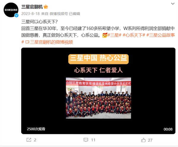 据三星介绍,W系列所得利润全部捐献中国做慈善,真正做到心系天下,心系公益,截至2023年,三星已经建设168所希望小学。