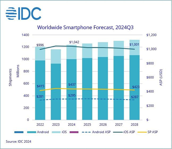 IDC还表示,尽管增长放缓,但苹果的溢价策略使其保持了较高的利润率,iPhone平均售价超过1000美元,而安卓手机的平均售价约为295亿美元,不到iPhone的三分之一。