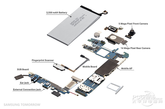 这是各种零部件的集合。S6的电池容量不高,但依然占了很大一块,电池技术令人捉急啊。
