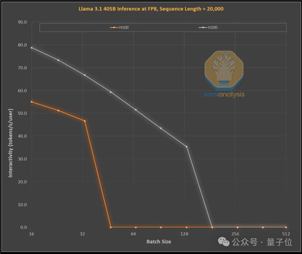 下图是在不同批处理大小下,使用H100和H200两种GPU处理长序列时,Llama 3.1 405B在FP8精度下的处理速度。