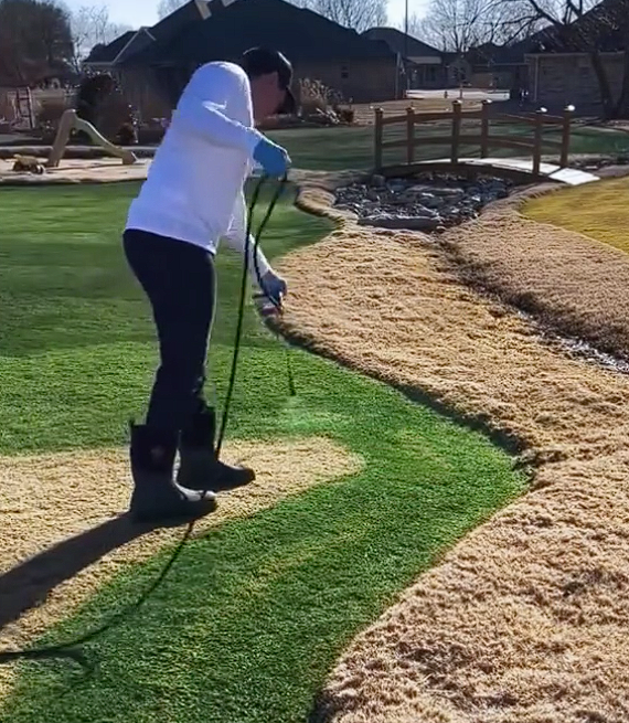 那么工人喷的是什么呢?其实这可不是绿漆,而是专用的增绿剂,可促使草坪快速生长复绿。