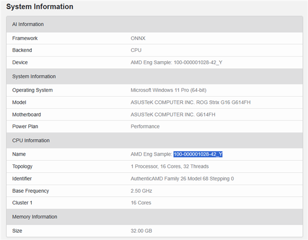 系统检测它有16核心32线程,基准频率2.5GHz,显然是取代锐龙9 7945HX的旗舰型号,后者也是16核心32线程,基准频率也是2.5GHz,只不过基于Zen4架构。