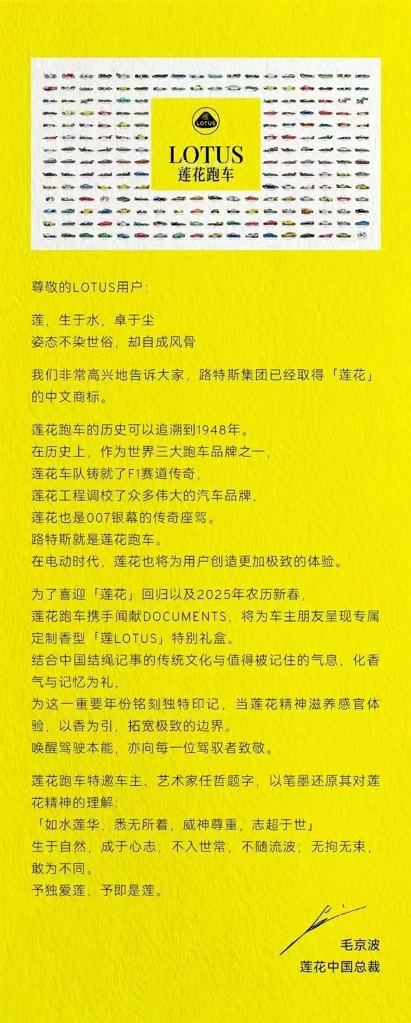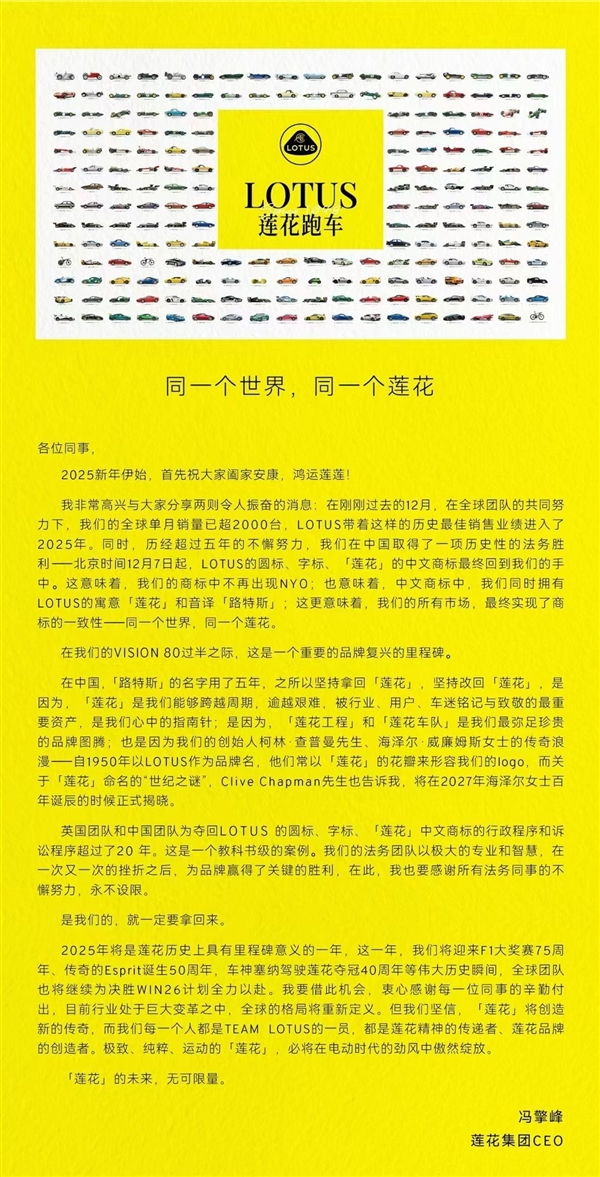 同时他还称,之所以坚持拿回“莲花”,坚持改回“莲花”,是因为,“莲花”是我们能够跨越周期,逾越艰难,被行业、用户、车迷铭记与致敬的最重要资产,是我们心中的指南针;